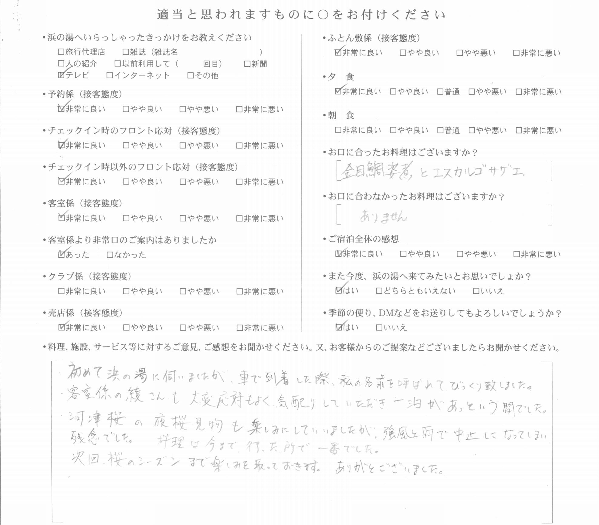 ご宿泊、アンケートへのご協力、誠にありがとうございました。
