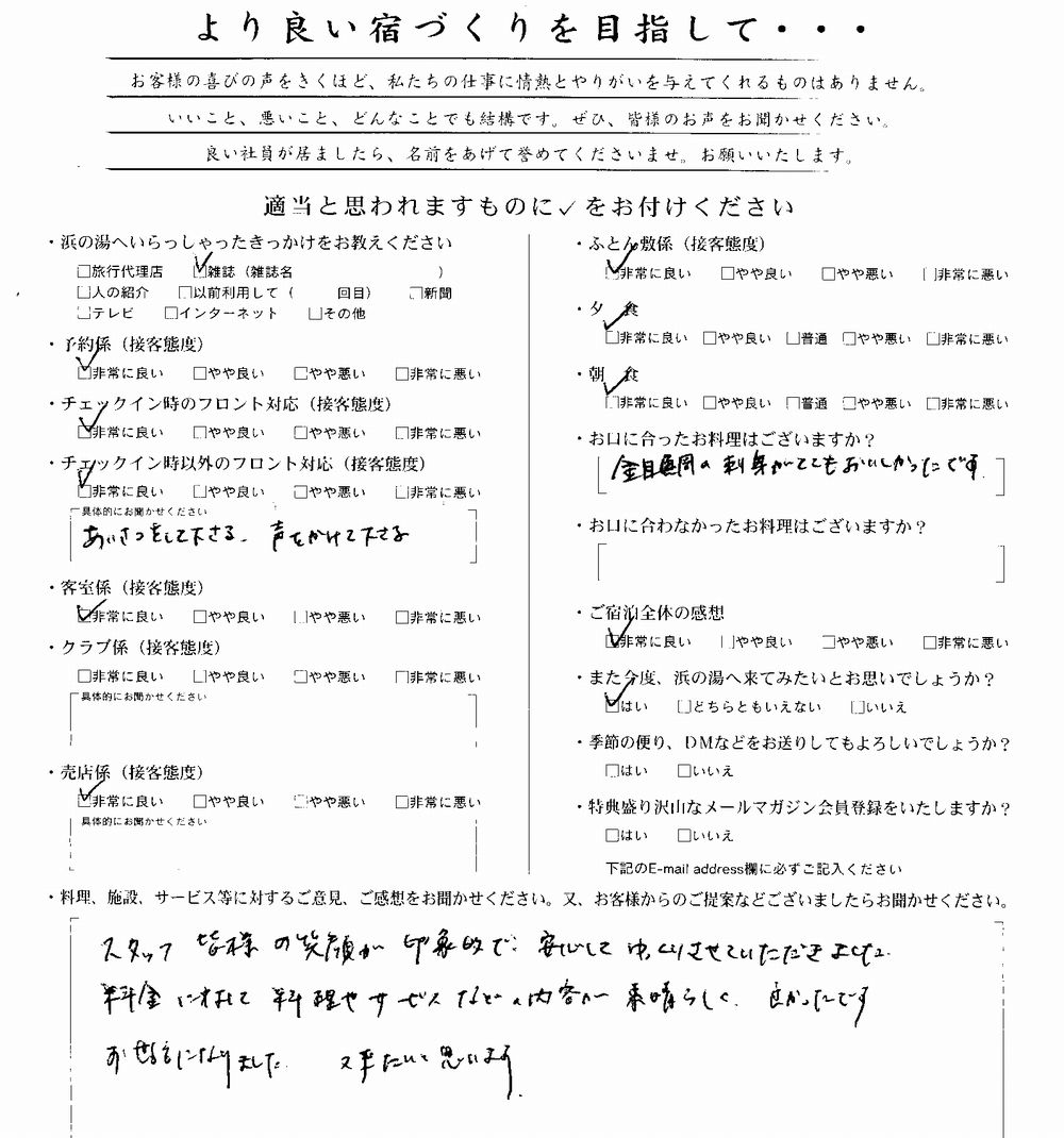 2009.05.20 / 新着情報 2009年5月16日 ご宿泊のお客様 ご宿泊、アンケートへのご協力ありがとうございました。 またのご来館を心より申し上げます。 食べるお宿 浜の湯 スタッフ一同 海側標準客室の詳細とご予約はこちら