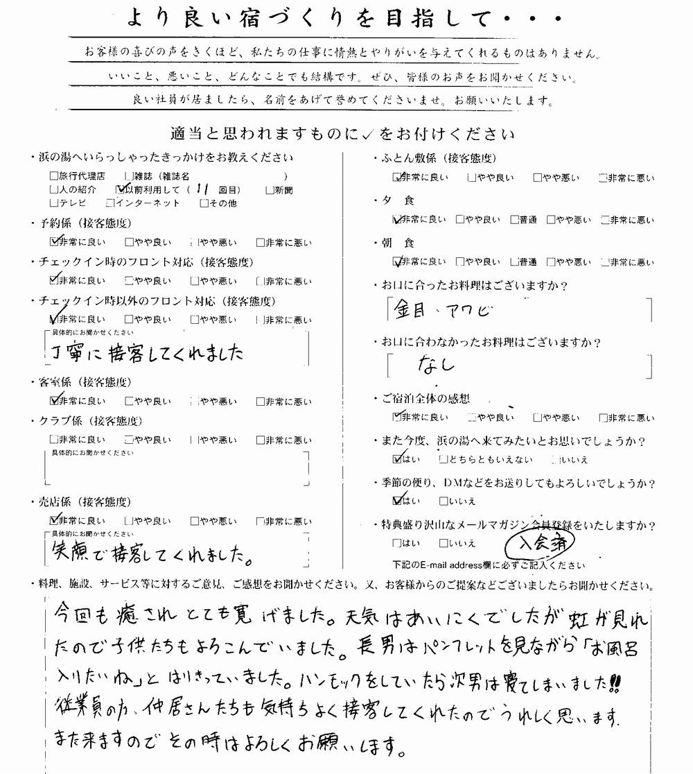 2009.06.30 / 新着情報 2009年6月28日 ご宿泊のお客様 ご宿泊、アンケートへのご協力ありがとうございました。 またのご来館を心より申し上げます。 食べるお宿 浜の湯 スタッフ一同 プラン一覧とご予約はこちらから
