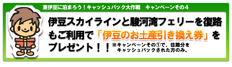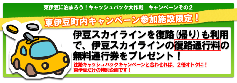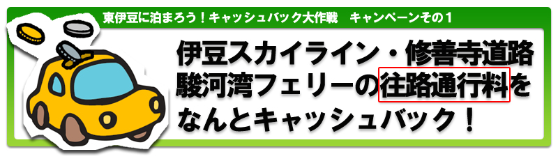 2009.07.23 / 新着情報 伊豆スカイライン通行料キャッシュバック!! 伊豆に泊まろう!大作戦 7月1日~8月31日まで、キャンペーン参加の宿にお泊りのお客様を対象に 伊豆スカイラインを往復、通行料金を無料でご利用いただける キャンペーンがあります。 その他、修善寺道路や駿河湾フェリーの特典やスピードくじなど・・・ の特典もあるキャンペーンです。 詳しくは東伊豆町観光協会のホームページで↓↓↓ http://www.e-izu.org/event_info/2009skyline.html