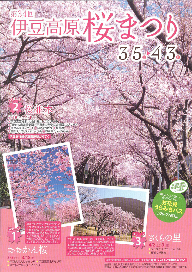 2011.03.10 / 新着情報, 観光情報 伊豆高原 桜まつり 毎年春だけあらわれるピンク色のトンネルは、桜並木が作り出した春の芸術です。 露天市やステージイベントが催され、たいへん賑わいます。 詳しくは↓↓↓ http://www.izukyu.co.jp/kanko/sakura2011/index.html
