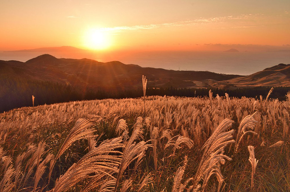 伊豆の海を後ろに高原にススキ野が黄金に輝き、