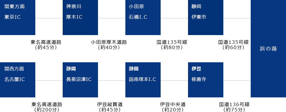 東京駅から直通特急踊り子号をご利用の場合、約2時間30分、新幹線・電車の場合は、約2時間10分