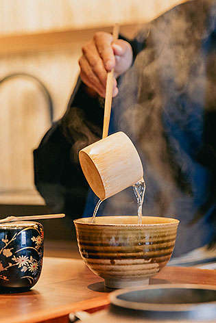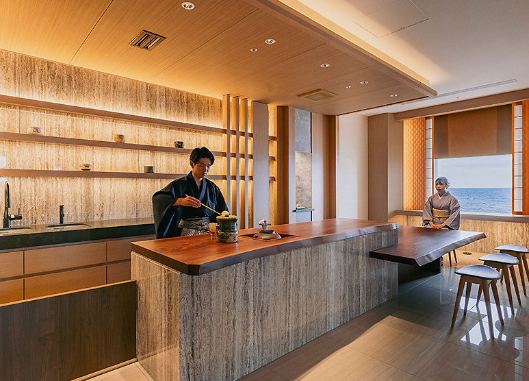 立礼茶室「ZEN」は肌で感じる日本の“礼”、裏千家の本格的なお点前を伝統美香るモダン空間でいただける茶処です。生涯一度きりの出会いを大切に、目の前のお客様を真心込めてお迎えする茶道の精神「一期一会」は、当館が目指すおもてなしの本質そのもの。呈茶はどなたにでもストレスなくご体感いただける立礼席(椅子席)にてご用意いたします。