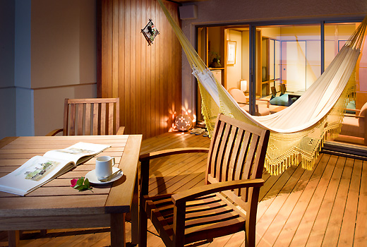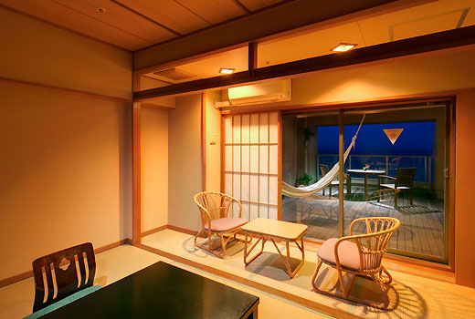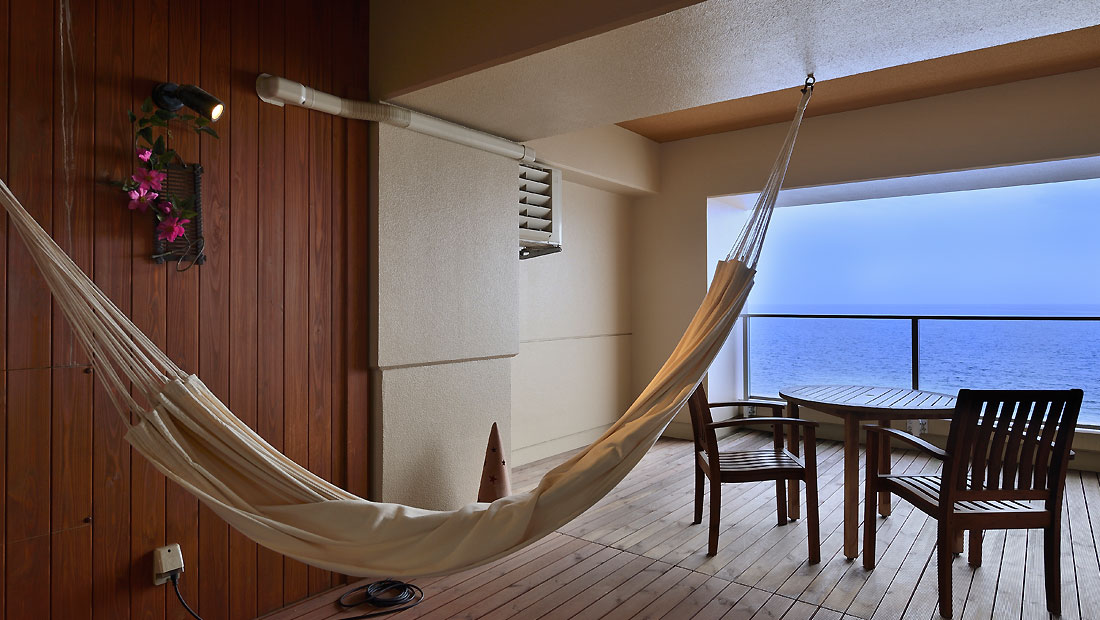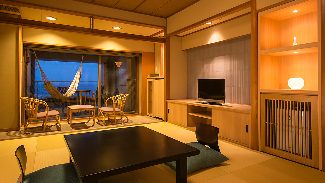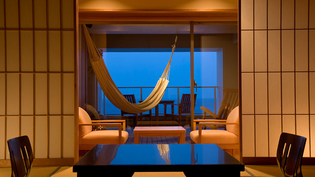 Fタイプ客室を改装し、新たに展望デッキテラス付モダン和室が誕生。デッキテラスはそのまま残し、客室内はリノベート改装。こちらのお部屋は禁煙室となります。展望デッキテラスからは水平線まで続く海と伊豆大島が望めます。お部屋にはハンモックとテーブルセットがあります。お天気がよければ朝食をデッキテラスでとることも可能です。(二名様限定) リゾート気分満点のお部屋です。ワンランク上のお部屋で、至福のひとときをお過ごし下さいませ。