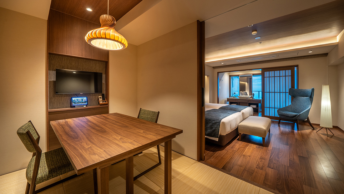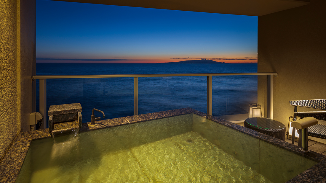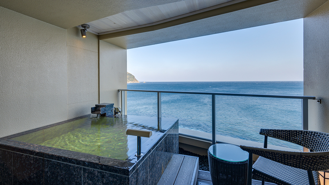 お二人で過ごす海辺の休日をおもてなし。お食事は椅子テーブル型の畳ダイニングでゆったりと心ゆくまで。広い海原を見晴らす露天風呂で、贅沢な湯浴み時間をお愉しみください。