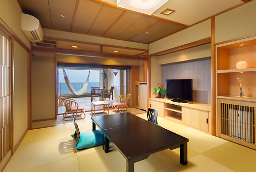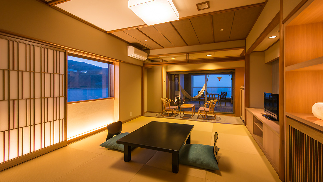 Fタイプ客室を改装し、新たにプレミアムコンパクトルーム角部屋(禁煙)が誕生。デッキテラスはそのまま残し、客室内は全面改装。さらにユニットバスからシャワールームに改装します。こちらのお部屋は禁煙室となります。展望デッキテラスからは水平線まで続く海と伊豆大島が望めます。お部屋にはハンモックとテーブルセットがあります。お天気がよければ朝食をデッキテラスでとることも可能です。(二名様限定) リゾート気分満点のお部屋です。ワンランク上のお部屋で、至福のひとときをお過ごし下さいませ。