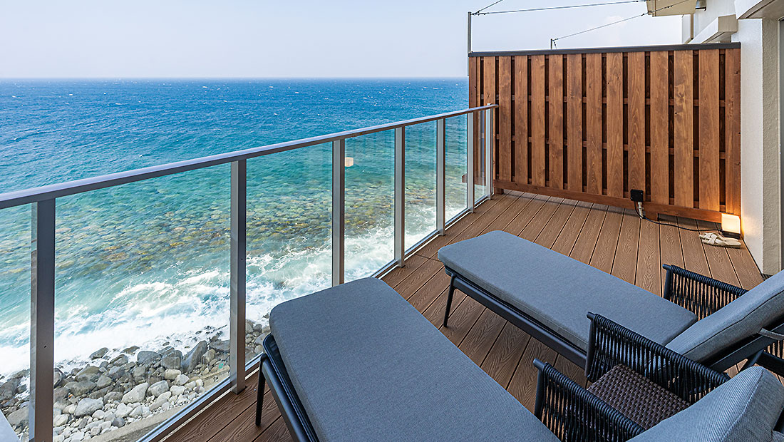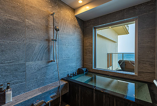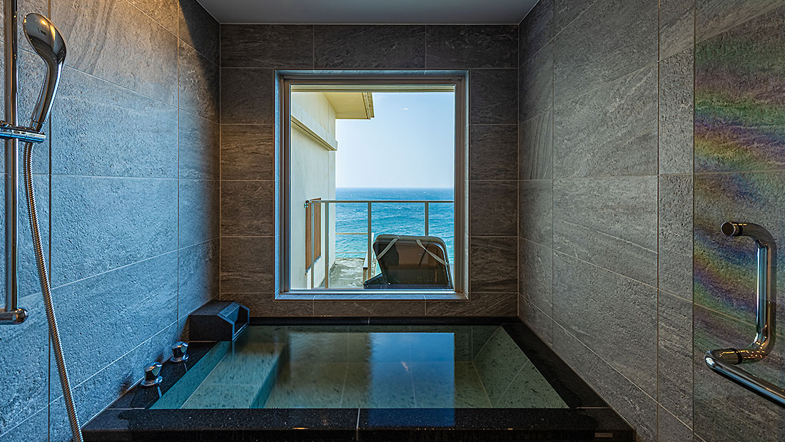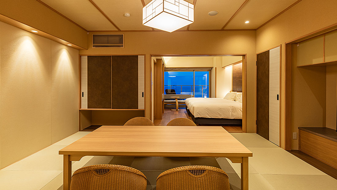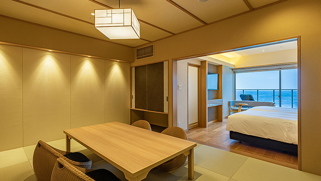 天然温泉のビューバスとテラスを設け、和室には伝統的な和の心を感じる低座卓を配備しました。ゆったりと心ゆくまで和室で贅沢なひとときをお過ごしくださいませ。過ごしやすさを追求した新しい和洋室タイプのお部屋です。ベッドルームからは水平線まで続く海と伊豆大島が望めます。ワンランク上のお部屋で至福のひとときをお過ごしください